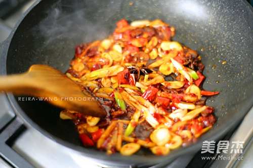 5另起炒锅,热油,加郫县豆瓣酱炒出红油,加花椒粒、干辣椒段翻炒,接着加葱姜丝、蒜片、八角炒香;