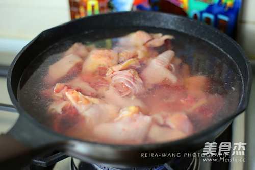 3将鸡块入冷水锅加热烧开,待煮开后捞出鸡块沥干备用;