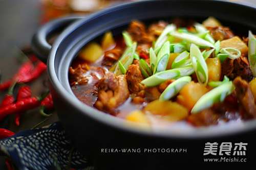 8接着盖盖,转小火焖煮至鸡肉烂熟,出锅时撒些葱花即可。因为这里的配菜是土豆,就跟鸡块一起煮,如果放的是莴苣,就等鸡块焖好后再下莴苣煮至莴苣断生就可以了,因为莴苣是很容易熟的。