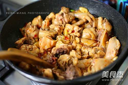 6接着下鸡块翻炒,倒入适量的生抽、盐调味;