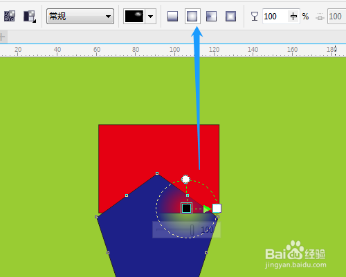 属性栏中选类型如椭圆形渐变,移动黑色小方框至合适位置,拖动白色小方框调整范围。