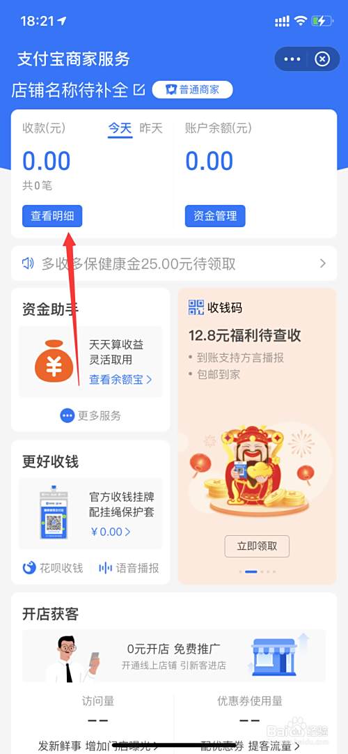 点击进去,如图位置就可以查看到“当天支付宝收款笔数”