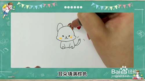 首先画出肉嘟嘟的脸蛋和尖尖的竖起来的三角耳朵,接下来画出坐下状态的身体和小爪子、小尾巴。