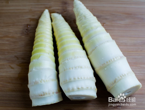 首先将所有的食材都准备到位,春笋准备出适量,将其去壳后,放入在事先准备好的淡盐水中浸泡一会,然后仔细清洗干净,然后将春笋放在案板上;