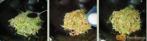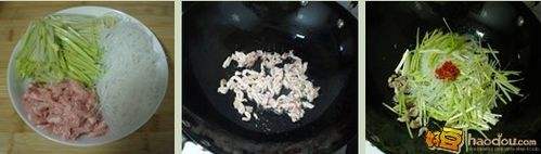 热锅放油,下入瘦肉丝,快速划炒至肉丝变色;
