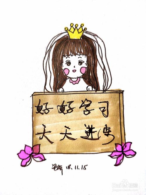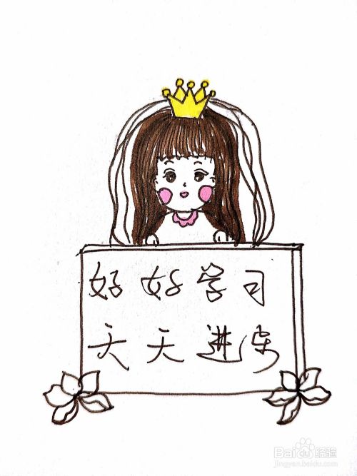 我画的是一个带小王冠、有公主范的可爱女孩,手中拿着“好好学习,天天进步”的牌子,用的工具是黑笔和马克笔。
