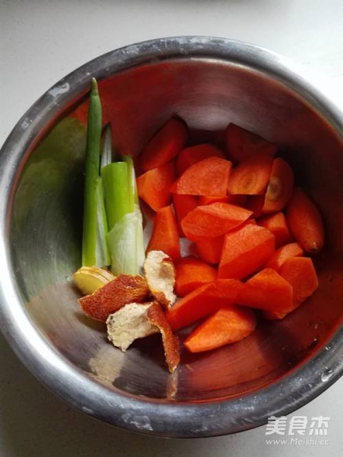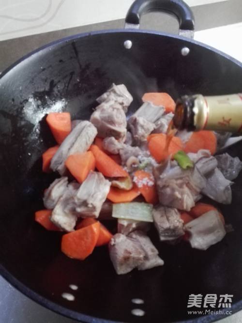 6放入胡萝卜炒匀,放入一汤匙料酒