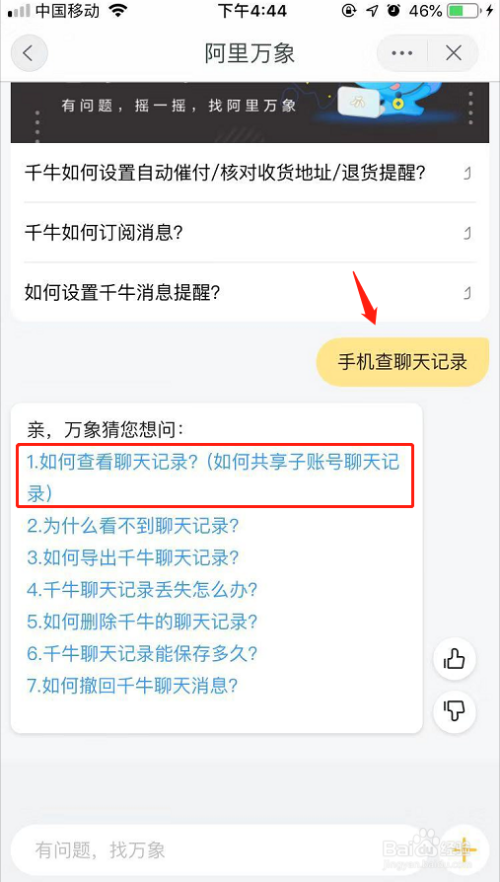 页面会自动 跳转到“阿里万象”页面!在下方直接录入“手机查聊天记录”问题!