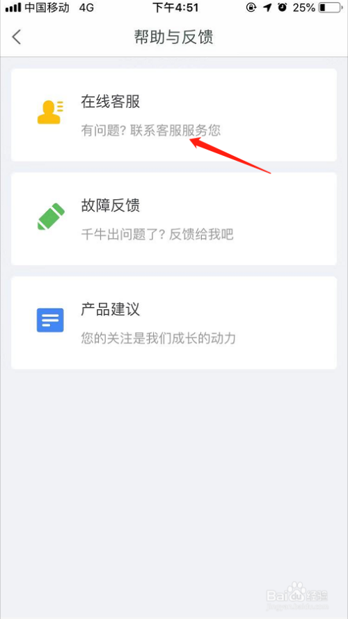 进入“帮助及反馈”页面后,点击“在线客服”命令!如图所示!