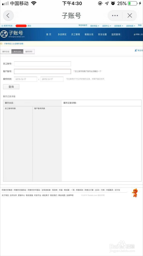 点击“员工账号”位置,页面会自动放到,并在弹出员工账号下拉条,我们点击要查看聊天记录的员工花名,点击下方的查询,就可以查看聊天记录了!