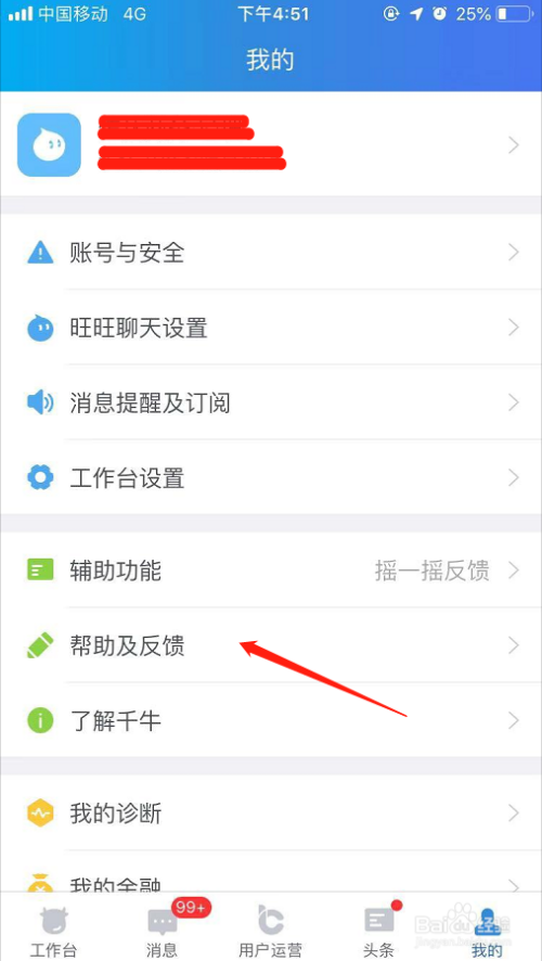 在我的页面,点击“帮助及反馈”命令!如图所示!