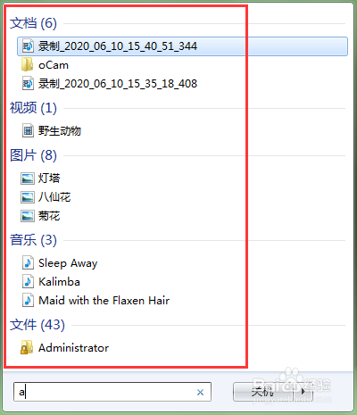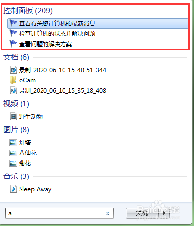 如图所示,我们在开始菜单的搜索框中键入字符可以搜索全部信息,现在我们需要限制用户在此处对控制面板的搜索