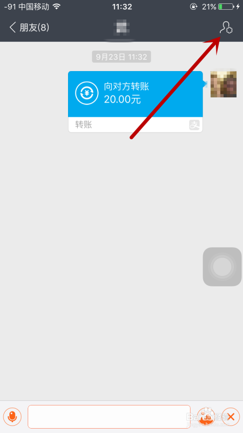 在聊天框里保存着我们的聊天记录和转账记录,点击右上角的人形图标;