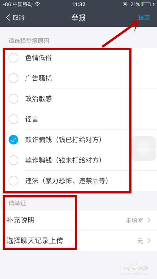 然后就是选择举报原因,选择完举报原因我们下方提示请举证,填写补充说明和发送聊天记录,这些是举报的有力证据,然后点击上方的提交即可。