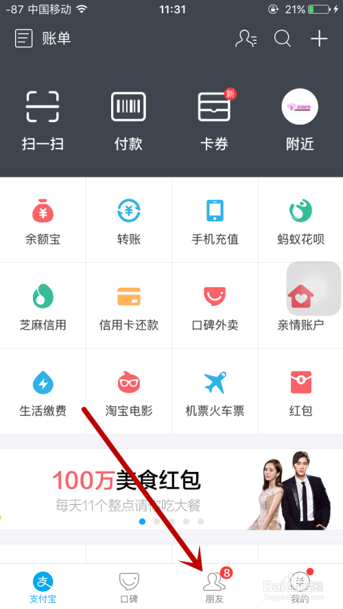 接着进入到支付宝主界面,我们点击下方的朋友;