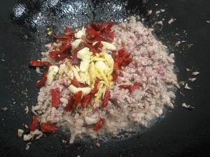 肉末翻炒3分钟已略微爆出了猪肉的香味,这时加入干辣椒、姜蒜末,中火继续翻炒2分钟。