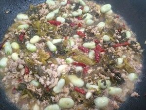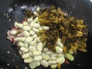 2分钟后,加入蚕豆、酸菜、盐少许、生抽少许、水300ml(矿泉水瓶半瓶多)。