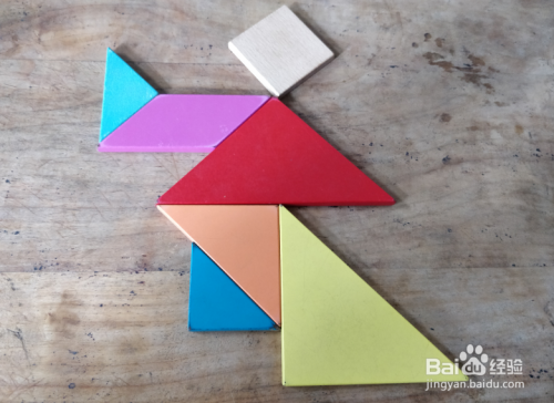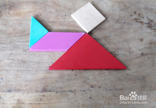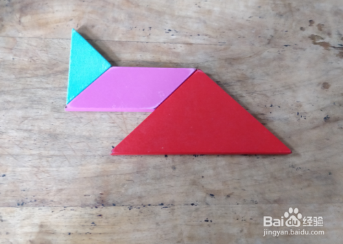 摆上正方形,放在红色三角形的上面挨着,如图。