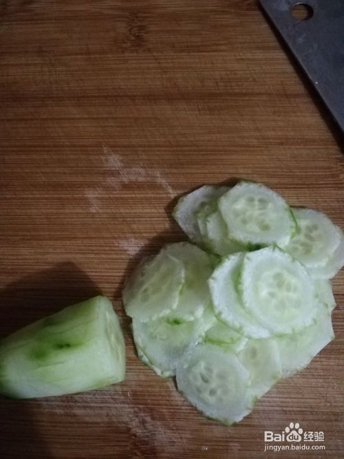 把黄瓜切成3-5mm厚的薄片,备用,黄瓜做面膜是给肌肤补水;