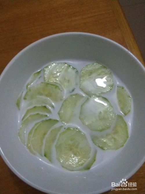 把牛奶倒在碗里,把黄瓜放在牛奶里,牛奶可以美白,那么牛奶倒多少呢,牛奶要保证每片黄瓜都能吸收到奶,也就是说牛奶倒到能没过黄瓜就可以了;