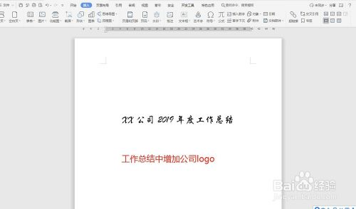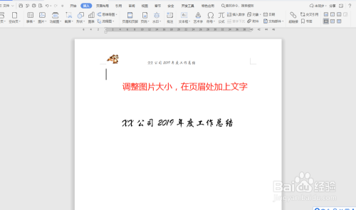 4:调整图片大小,在页眉处增加XX公司2019年度工作总结字样。