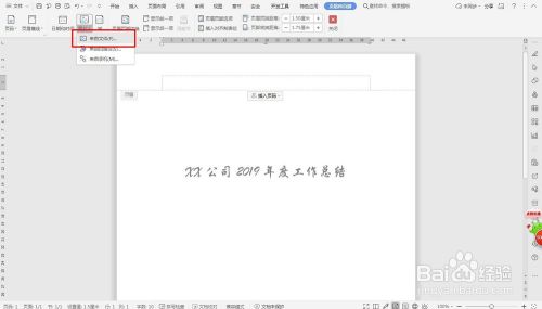 【调整图片大小】,在页眉处增加【XX公司2019年度工作总结字样】。