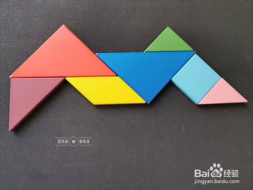 拿出一个深蓝色大三角形放在黄色平行四边形的旁边,如下图所示。