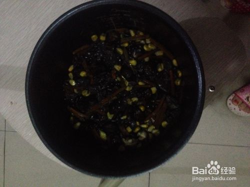 将洗净的大米倒入电饭锅内,倒适量水,加入玉米粒,胡萝卜丝,香菇