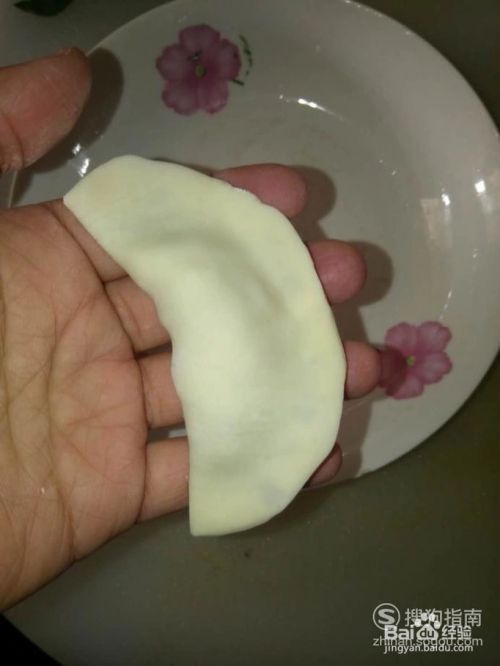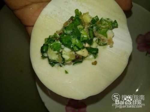 取一个饺子皮,用勺子舀入适量的馅料,放在饺子皮的正中间;将饺子皮对折,再捏合即可;