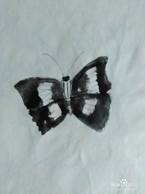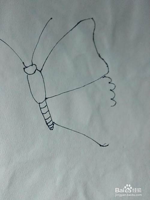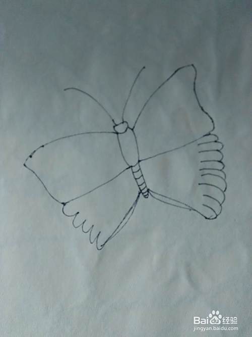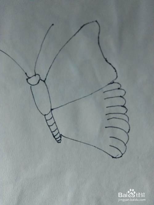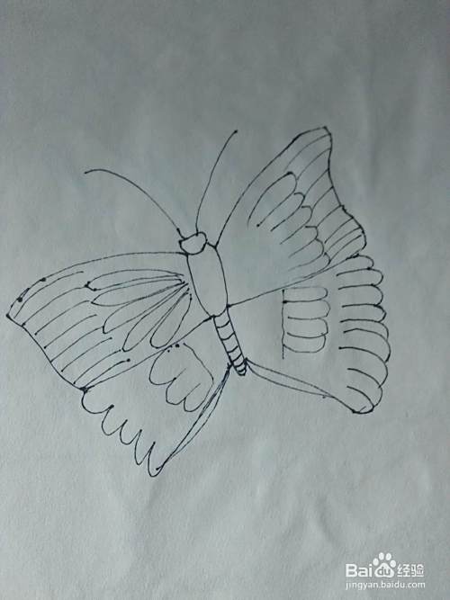 画后右边的以后,在用同样的方法画出左边的翅膀。蝴蝶的外形就完成了,下边就是彩色。