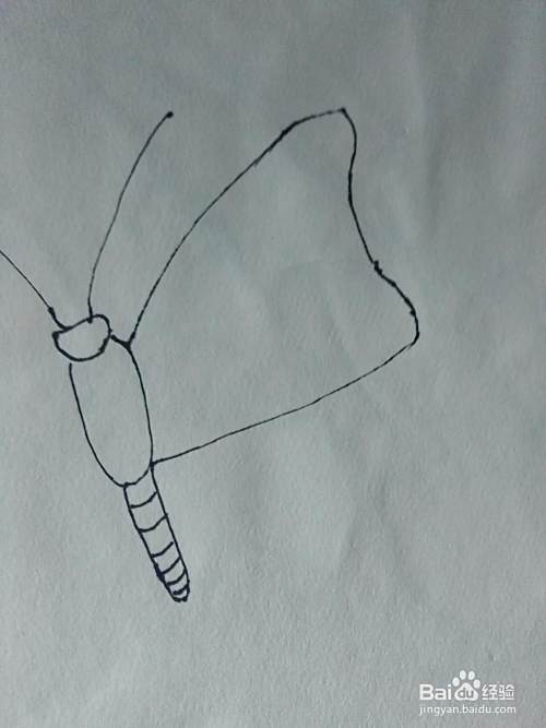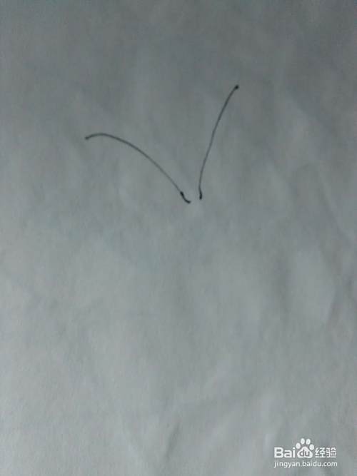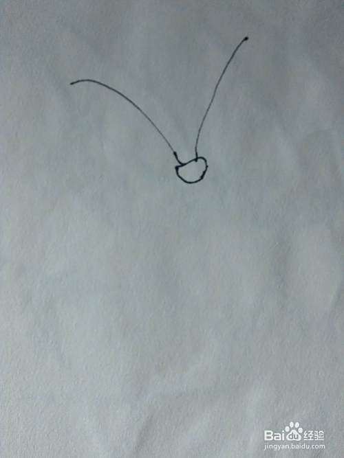 先用笔在白纸上画一根向左弯曲的弧线,在画一根向右弯曲的弧线,两根蝴蝶的触须就画好了,接下来画出头部,头部就像一颗豆子