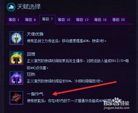 使用技能后,6秒内的下一次普通攻击造成40%的额外伤害,这个技能天赋要求我们保证技能的连贯性使用,走A的节奏