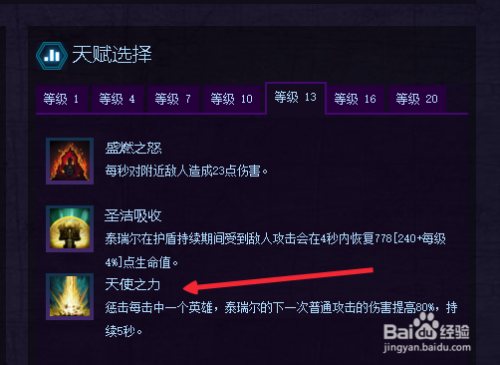E技能惩击每击中一个英雄,大天使的下一次普攻伤害提高80%,持续5秒。配合刚才那个走A天赋,普通攻击可以达到很高的值。