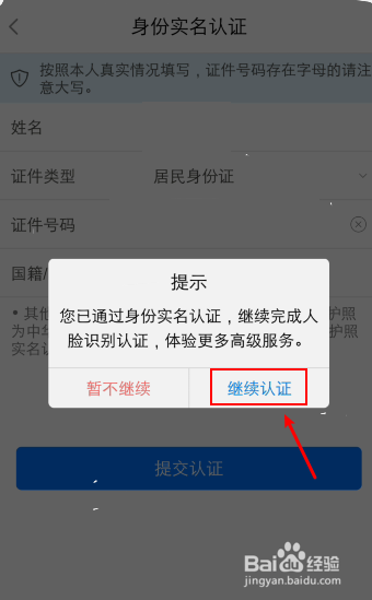 认 证 成 功后,再点击【继 续 认 证】,准备进行“人 脸 识 别”。