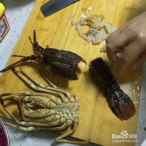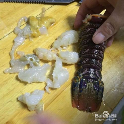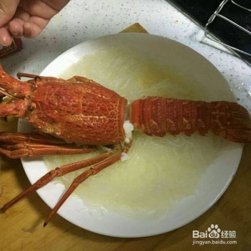 龙虾清洗干净,用剪刀剪开,尽量保留外壳的完整,把鳃和腥线去掉