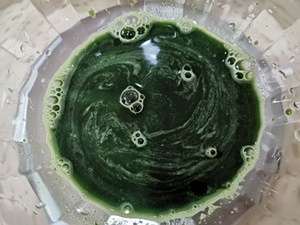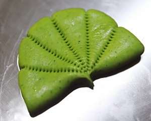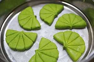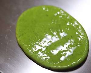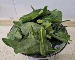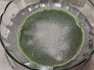 用开水烫一下菠菜叶,然后取出来放进破壁机,加一点点水打成泥。拿一个网筛,把汁过滤出来。称出拌面粉需要的菠菜汁100g。