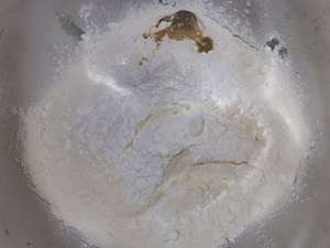 200g面粉、10g糖粉、1.5g小苏打、5g玉米油,用筷子稍微混合一下。