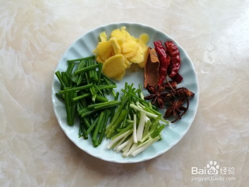 鸭肉热烫后,将姜去皮切成薄片,干辣椒切成小段,葱洗净,葱和叶分别切下