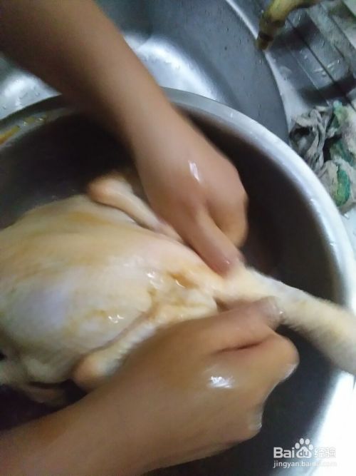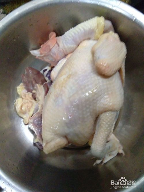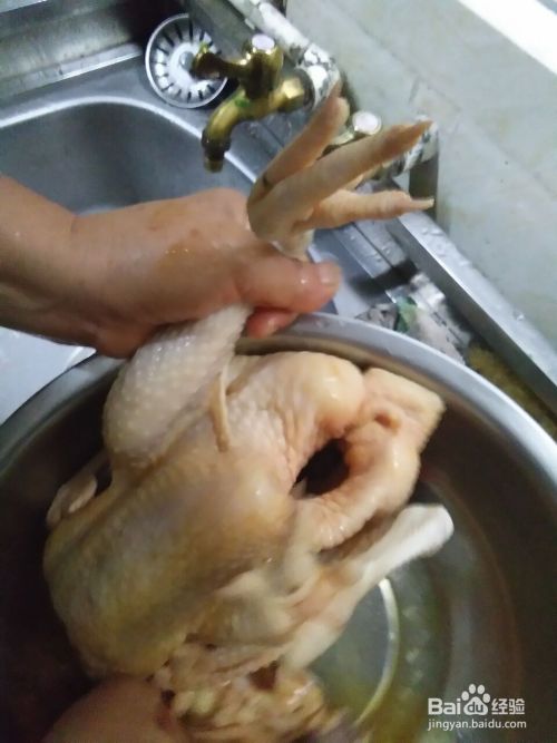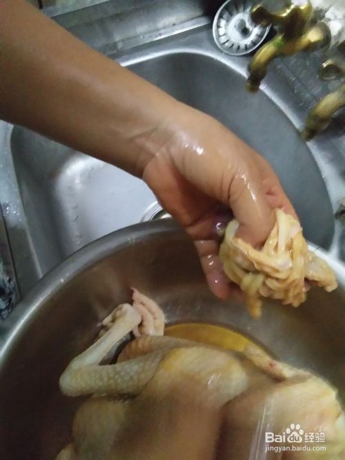 将拔好毛的整只鸡清洗干净,将内脏部分放置一旁,在鸡屁股附近切开一个口,清洗干净鸡内部;