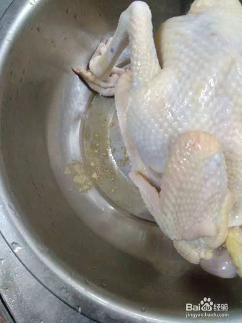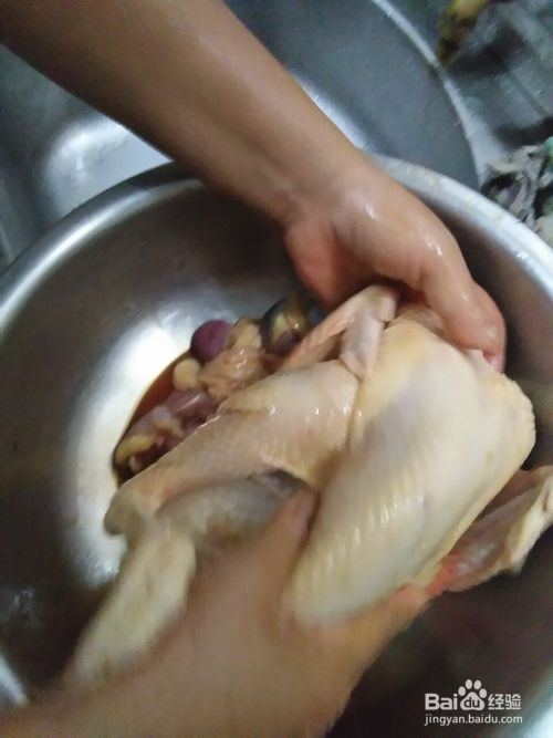 开始将配料涂抹在鸡身上各处,像按摩一样,倒入一部分的配料入鸡身里面,内脏部分也涂抹,涂抹按摩有5分钟左右即可放置在一旁,待20~30分钟左右之后放入蒸煮更入味。