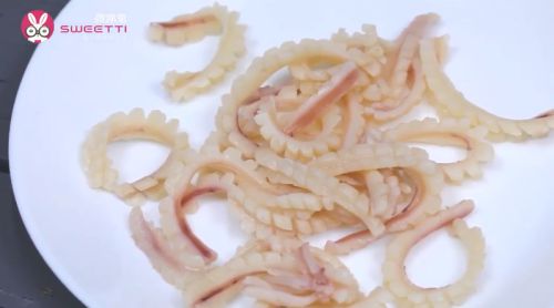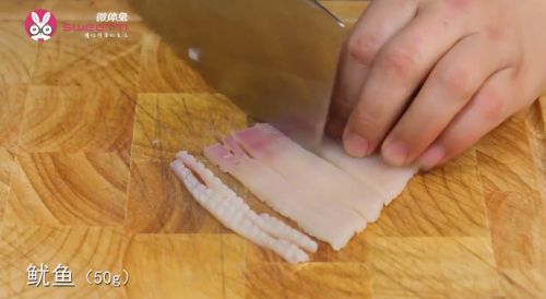 8鱿鱼洗净后切条备用。
