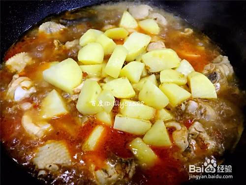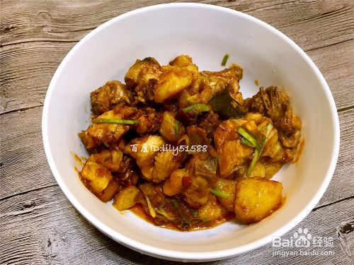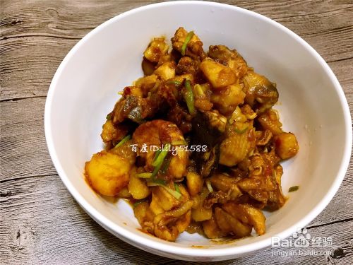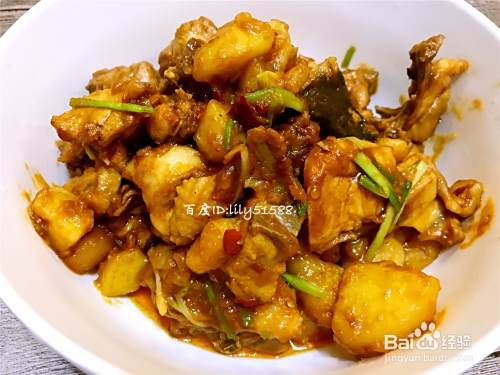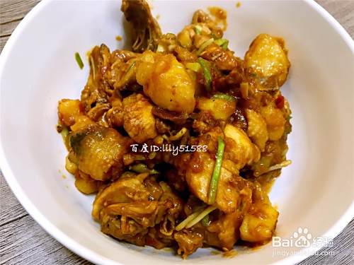 放入土豆和鸡肉一起再烧8分钟,待土豆熟了之后,放入小葱,加入少许盐,蚝油调味,将鸡肉翻炒均匀,装盘。
