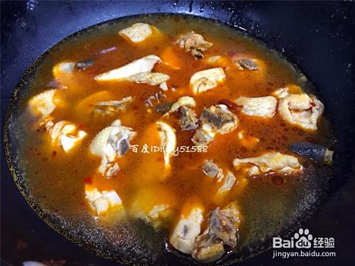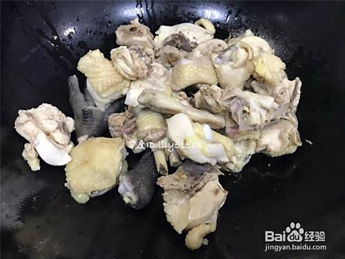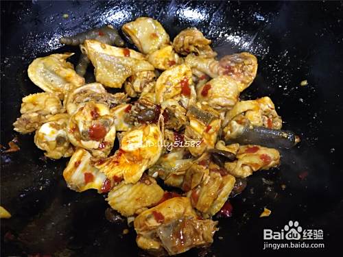 鸡肉的水份炒干后,加入1汤匙的料酒和2汤匙豆瓣酱一起炒,料酒可以去腥。加入适量的清水,加点老抽大火烧10分钟。
