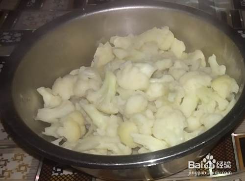 锅中烧水,水开把菜花焯水2分钟捞出控水。