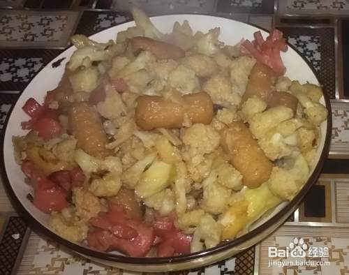 起锅烧油,油热放蒜苗爆香,倒入甜不辣小火腿翻炒一下,倒入菜花加少许酱油翻炒一分钟,加盐、味精翻炒均匀。关火装盘就可以上桌了。