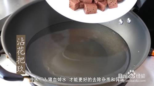 将猪血改刀切成小方块,切好后放入盘中,起锅烧水,冷水下入猪血焯水才能更好的去除杂质和异味,烧开后撇去浮沫,煮至三十秒钟,煮好了,捞出,放入凉水中过凉,这样口感滑嫩不易碎。
