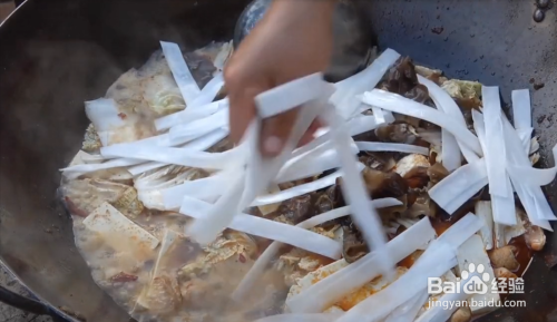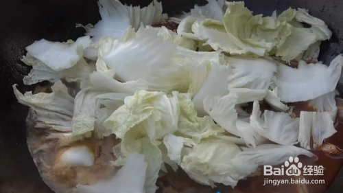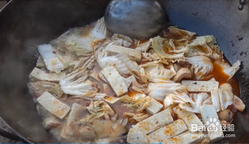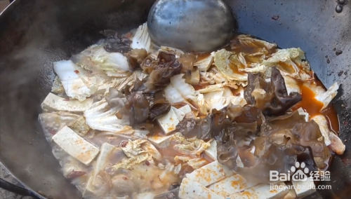 将准备好的白菜、木耳、豆腐、粉条加入到锅中,然后在加入盐、鸡精,小火炖上5分钟左右就好了;