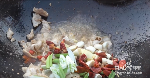 五花肉炒起后,倒入葱姜蒜,干辣椒和花椒