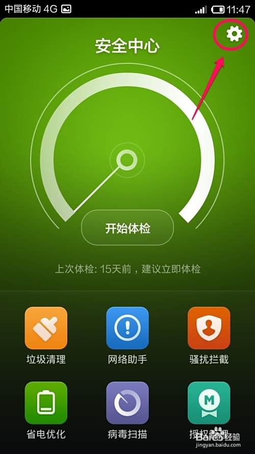 打开安全中心以后点击右上角的设置齿轮图标!