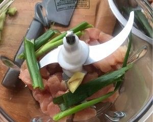 鸡肉切小块,放入葱段和一小块姜,打成肉泥